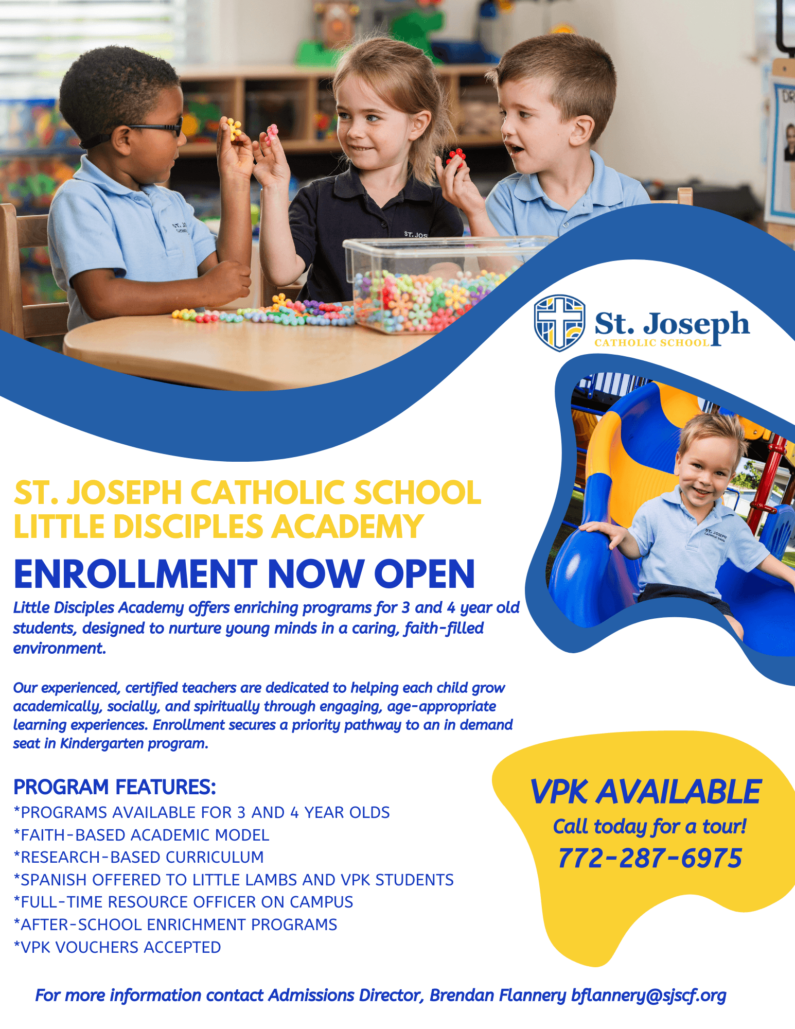 - St. Joseph Catholic School offers a three-year-old curriculum-based program which provides hands-on learning by State Certified Early Childhood Educators.