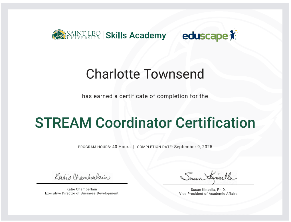 The St. Joseph Catholic School community expresses its heartfelt gratitude to all our wonderful donors, particularly the Bongino Family, for their generous contributions. Thank you for believing in our vision and helping us foster a creative and educational environment. Our lab instructor, Charlotte Townsend, recently was awarded STEM Coordinator from Skills Academy from Saint Leo University.